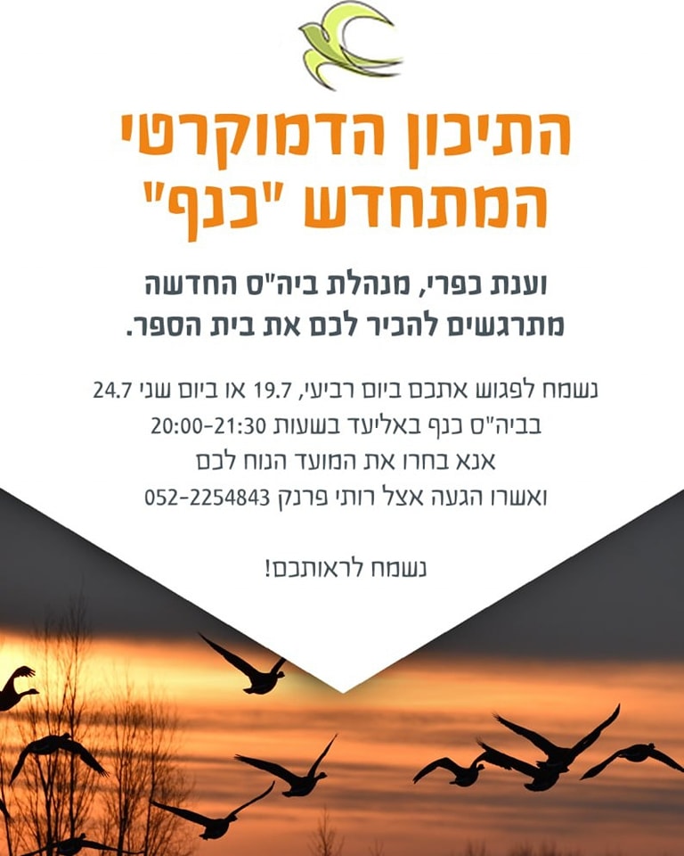 התיכון הדמוקרטי המתחדש "כנף", יחד עם מנהלת ביה"ס החדשה, ענת כפרי, מתרגשים להזמין את התושבים להכיר את בית הספר. שני מפגשי היכרות ייערכו בשבועיים הקרובים: ביום ד', 19.7.2023 וכן ביום שני, 24.7.2023, בביה"ס "כנף", במושב אליעד. שני המפגשים יתקיימו בין השעות 20:00-21:30.