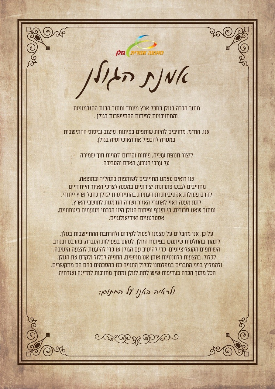 אמנת הגולן נכתבה במטרה לחבר את כל הגורמים הרלוונטיים לפעול לקידום ופיתוח הגולן. החתומים על האמנה מקבלים על עצמם לפעול לפיתוח, קידום, ביסוס ההתיישבות בגולן תוך קידום חבל ארץ ייחודי זה אל יעד הכפלת האוכלוסייה.